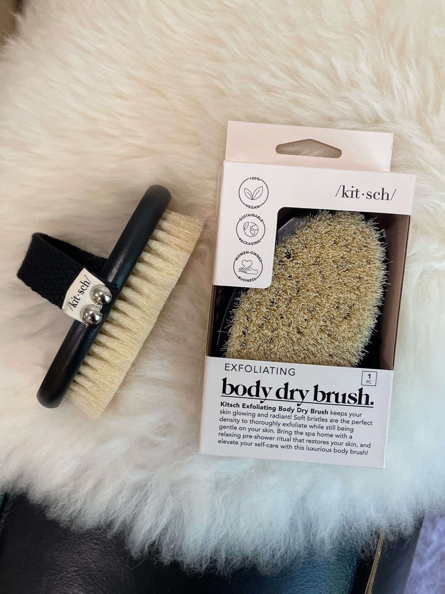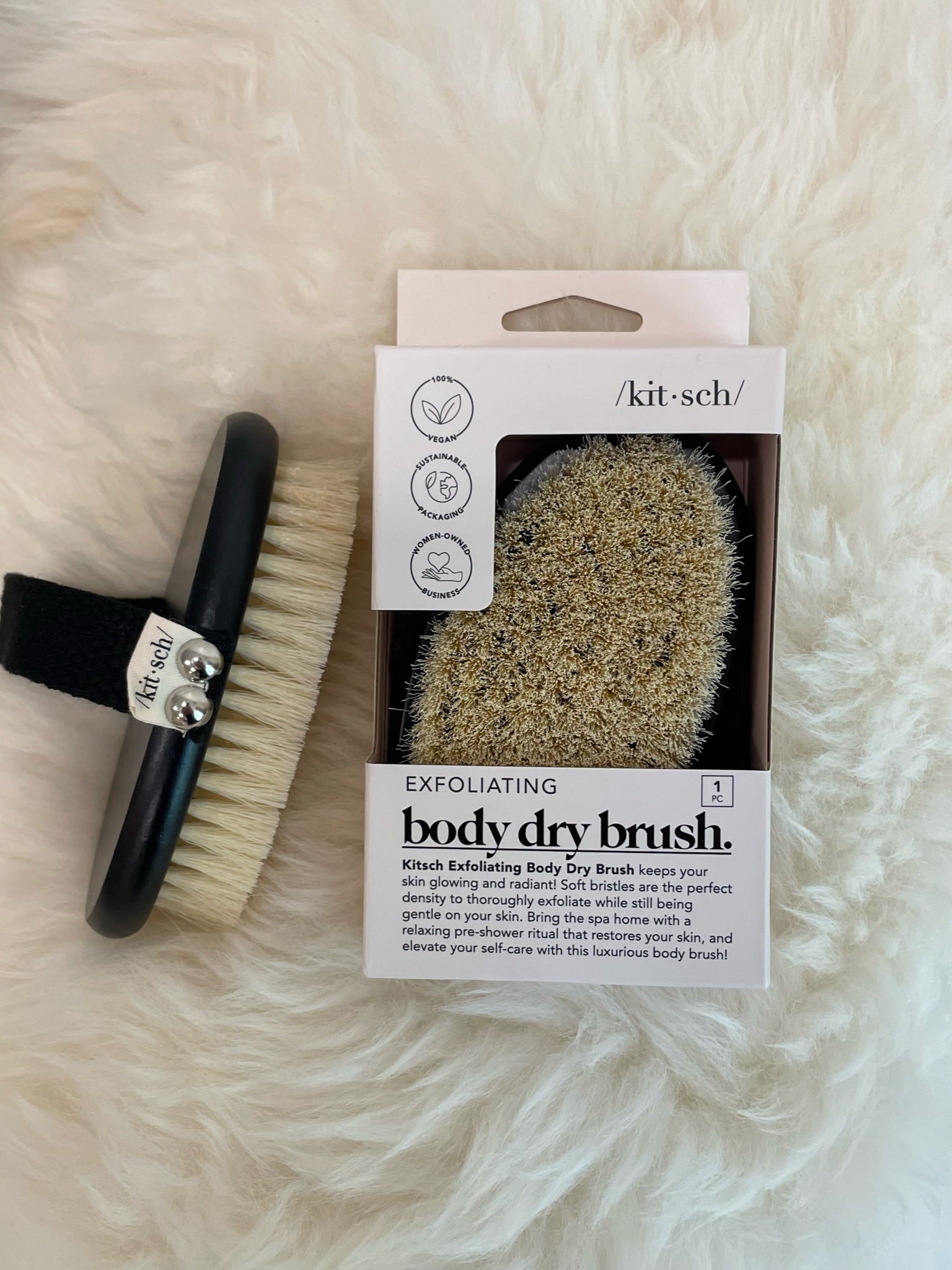The Kitsch Exfoliating Body Dry Brush is your go-to for revealing smooth, radiant skin from head to toe. Unlike traditional dry brushes, this one features super-soft, perfectly dense vegan bristles that provide effective exfoliation without harsh scratching, making it ideal even for sensitive skin.