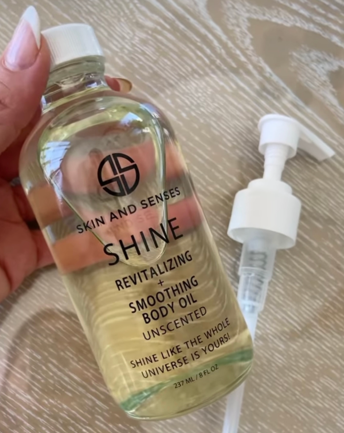 Shine Revitalizing & Smoothing Body Oil is a delicately light formula infused with aromatic botanicals that deeply restores, soothes, and hydrates dry, irritated skin leaving it soft, supple, and nourished without ever feeling greasy.
